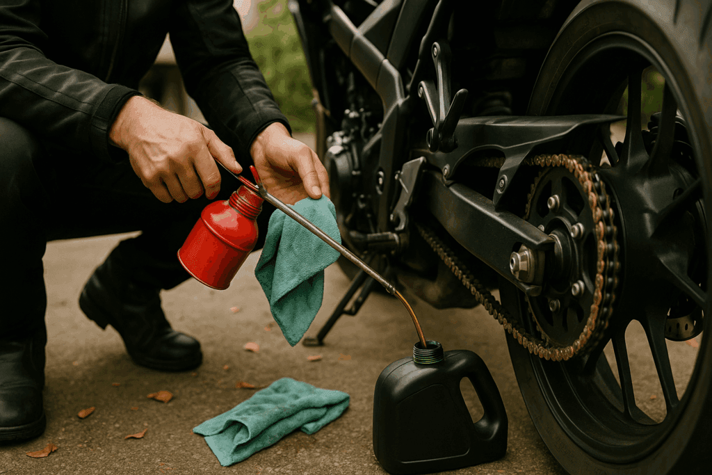 - チェーンは汚れをふき取り、専用オイルで注油:注油は200〜500kmごとが理想。砂ぼこりや雨天走行後は特に念入りに。清掃→乾燥→注油の順で行うと効果的。
