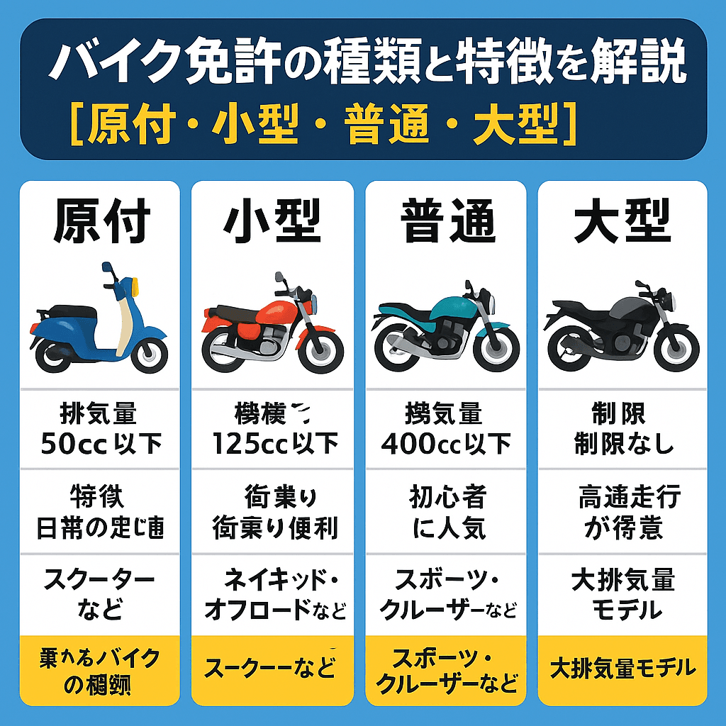 日本で取得できるバイク免許は、大きく分けて「原付」「小型二輪」「普通二輪」「大型二輪」の4つに分類されます。それぞれに対応する排気量や特徴、乗れるバイクの種類が異なるため、目的やライフスタイルに合った免許を選ぶことが大切です。
